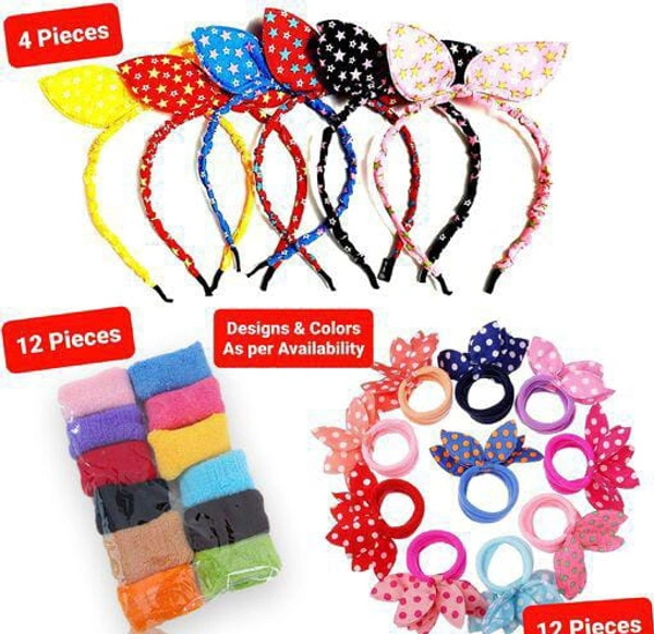Pack of 28 Pieces combo for Girls includes: 12 Pieces Multi Designs and Mult Colors Rabbit shape rubber Bands, 4 Pieces Multi Design and Multi Colors Rabbit Ear Shape Hair Band, 12 Pieces Towel Rubber Bands..